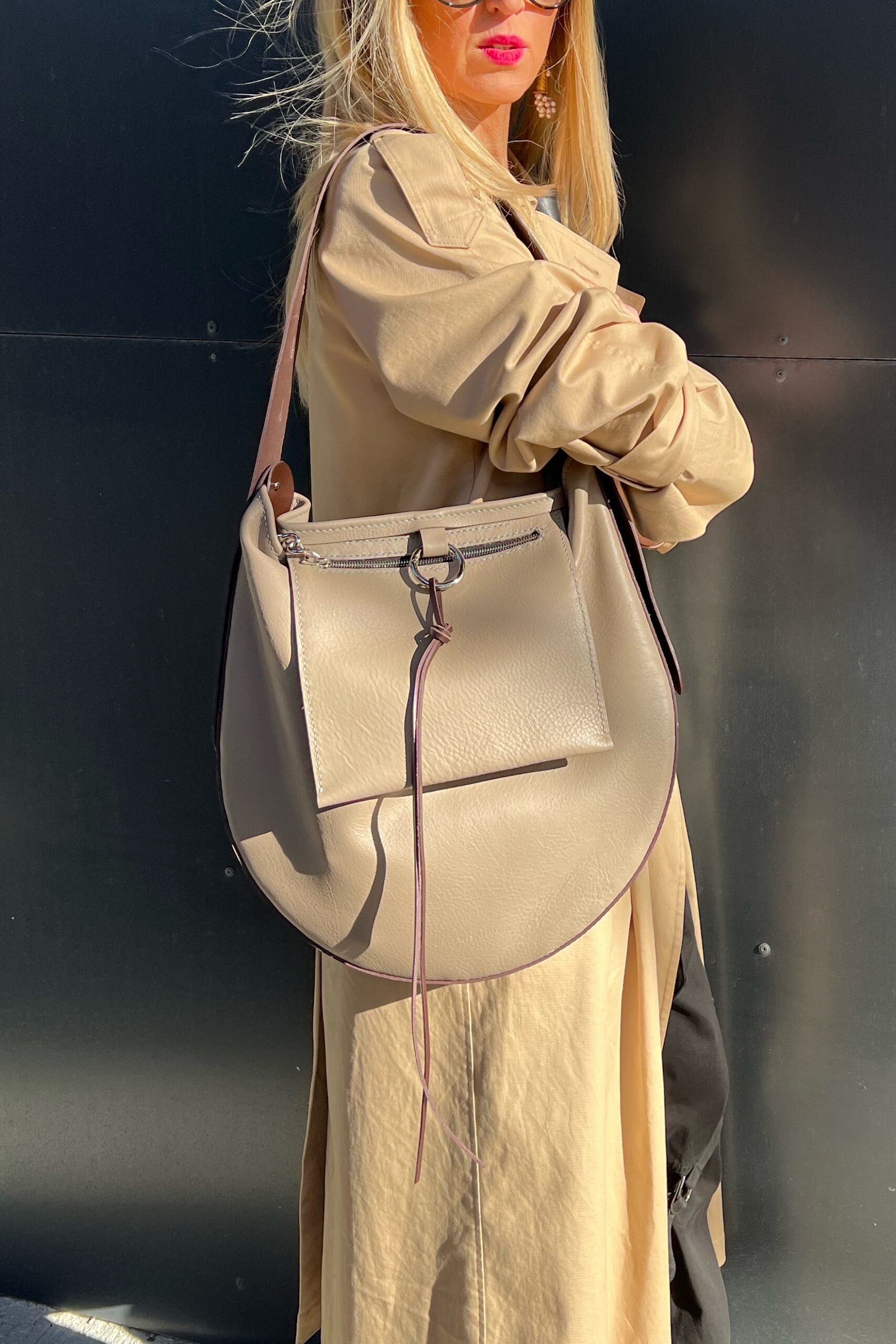 An adjustable strap offers versatile ways to wear the bag—over the shoulder, across the body, or carried by hand—adapting easily to your needs and movements throughout the day. Two zipped compartments provide secure and accessible storage, designed to keep your essentials organized without compromising the clean lines of the silhouette.